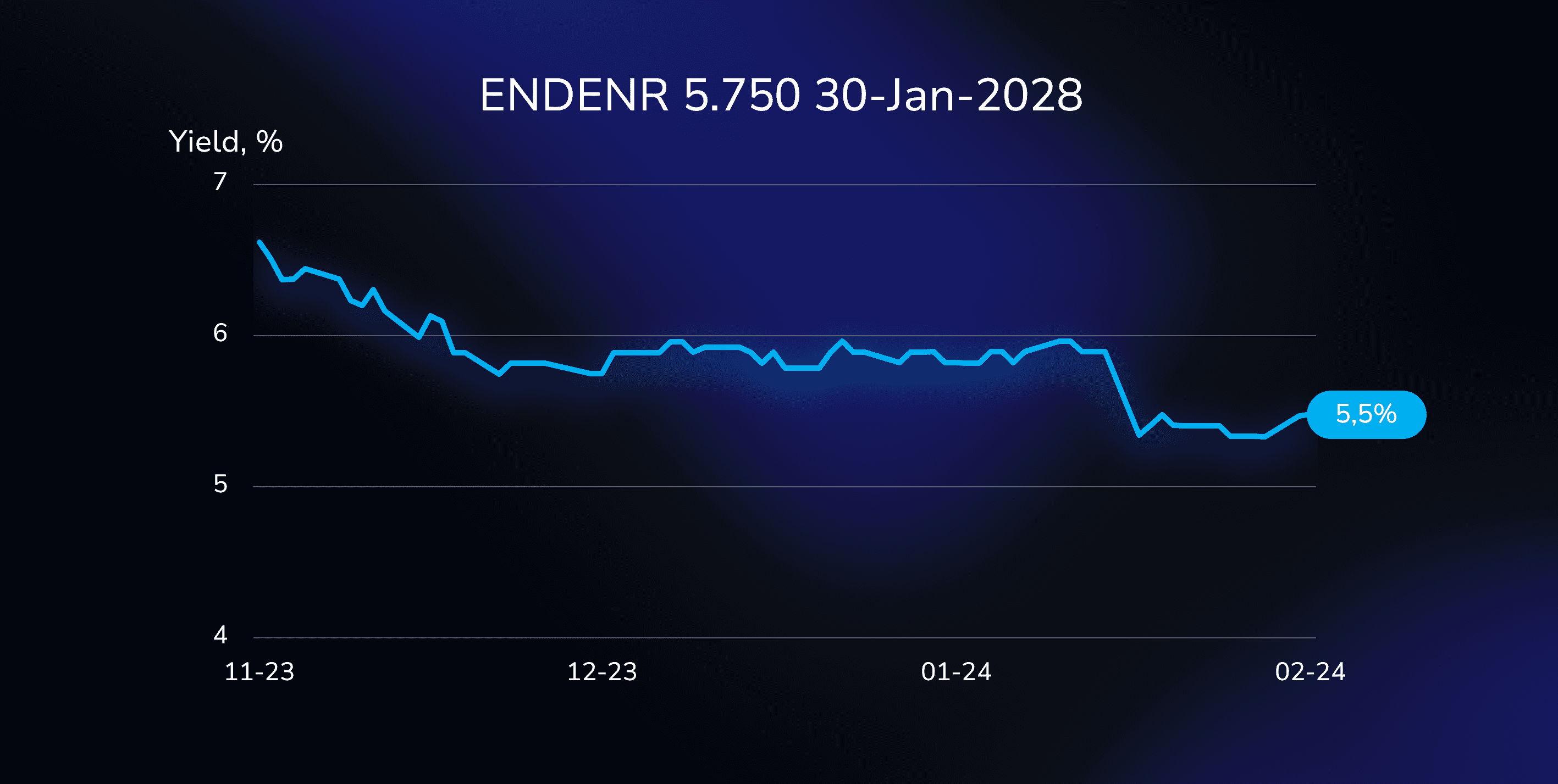The ENDENR 5.750 30-Jan-2028 USD (US29260FAE07) bond has seen a substantial shift in its yield, declining by 41 basis points to 5.5% over the month.