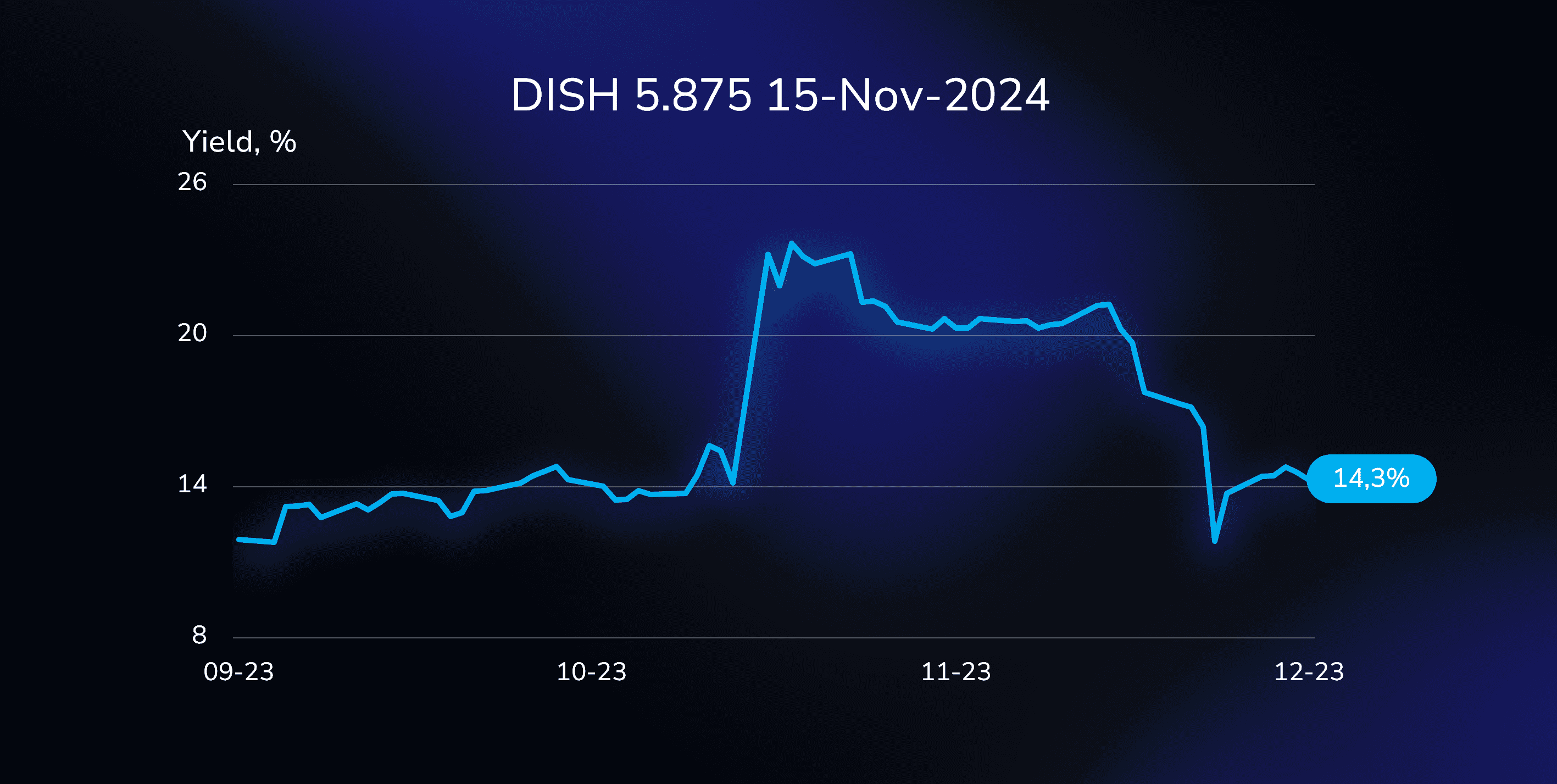 The DISH 5.875 15-Nov-2024 USD bond (ISIN: US25470XAW56) has seen a notable shift in its yield, dropping by a substantial 614 basis points to 14.3% over the past month.