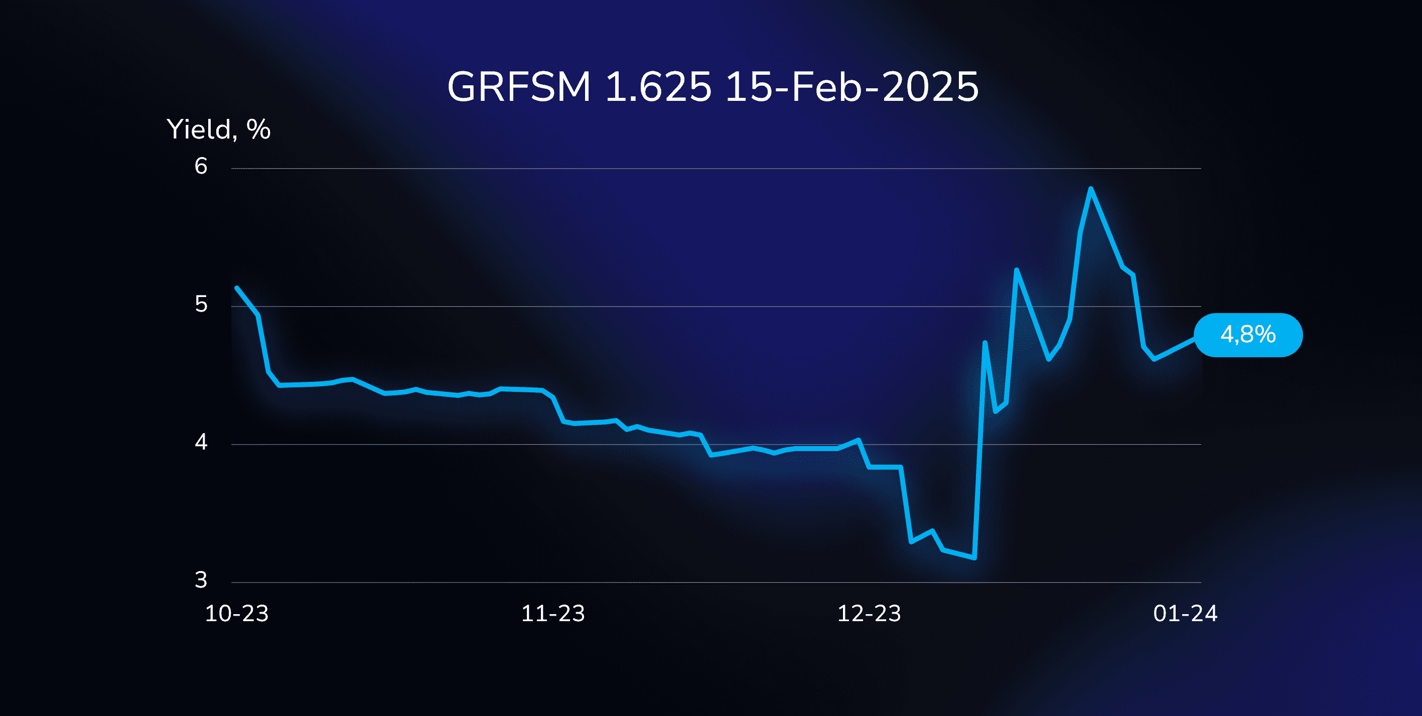 The GRFSM 1.625 15-Feb-2025 EUR bond (XS2076836555) has witnessed a notable shift in its yield, dropping by 108 basis points to 4.8% over the past ten days.