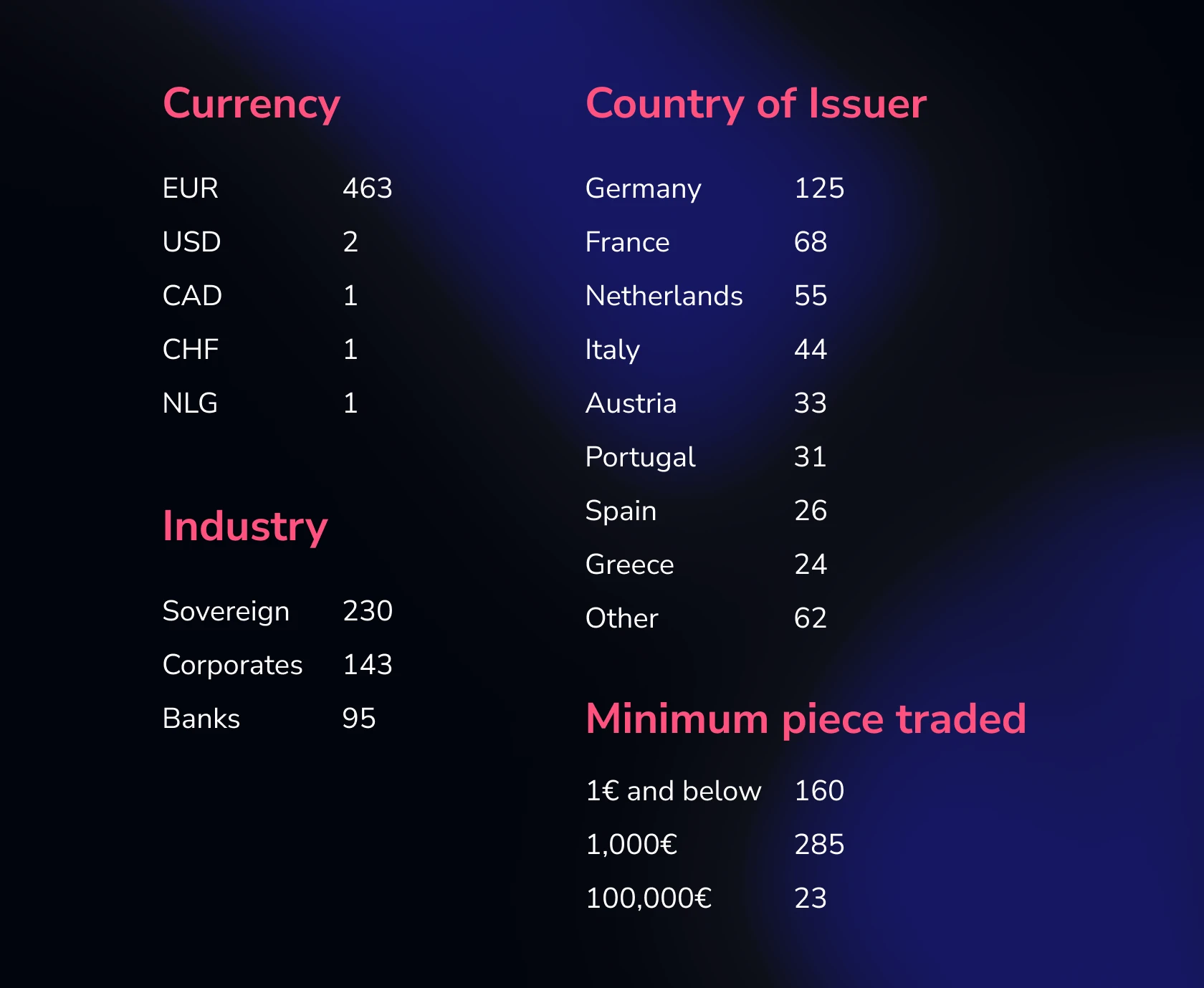 The average ask yield to maturity for bonds denominated in Euros available on the platform is 3.7%.