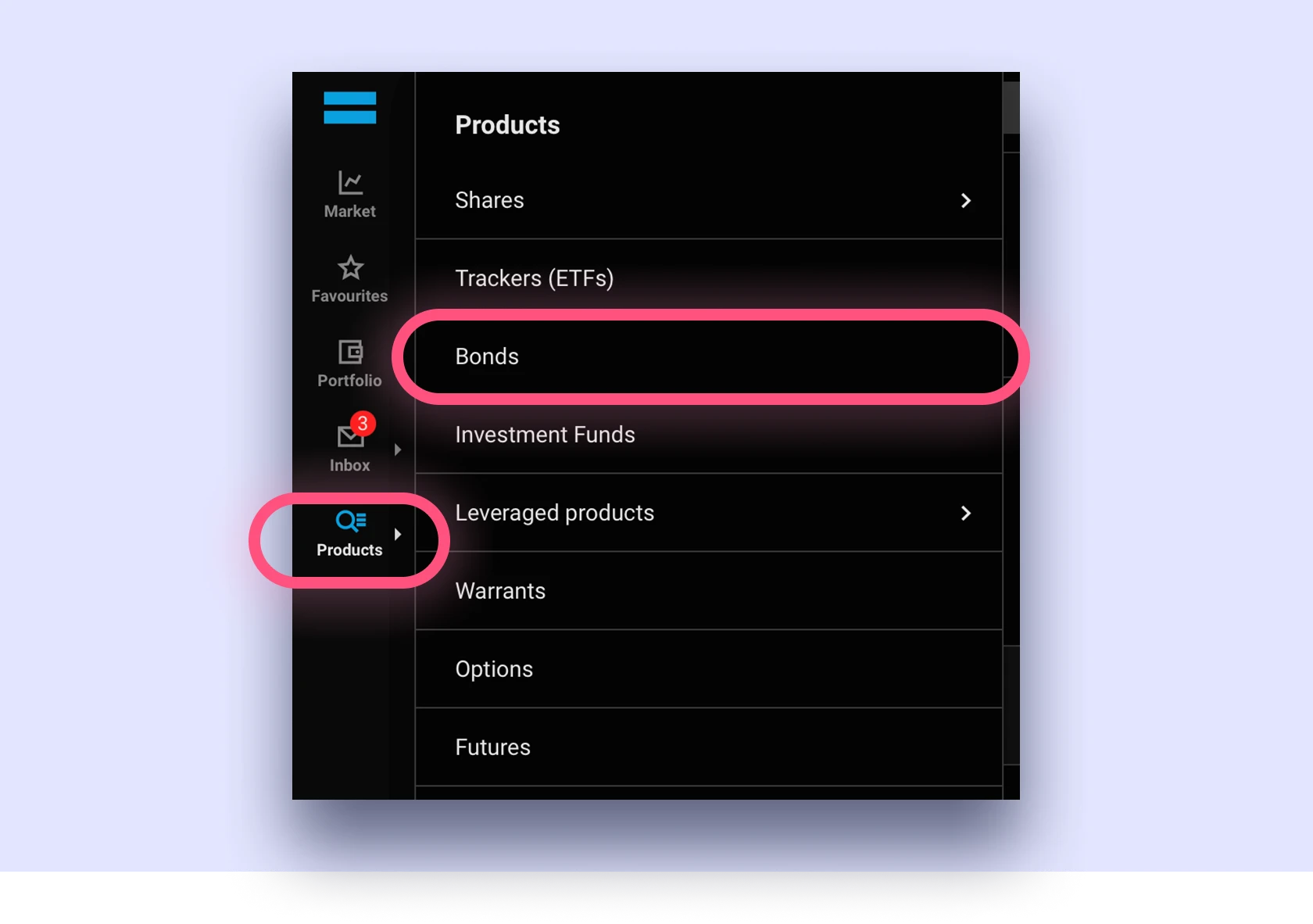 All bonds available for trading can be accessed by selecting Products - Bonds from the left sidebar: