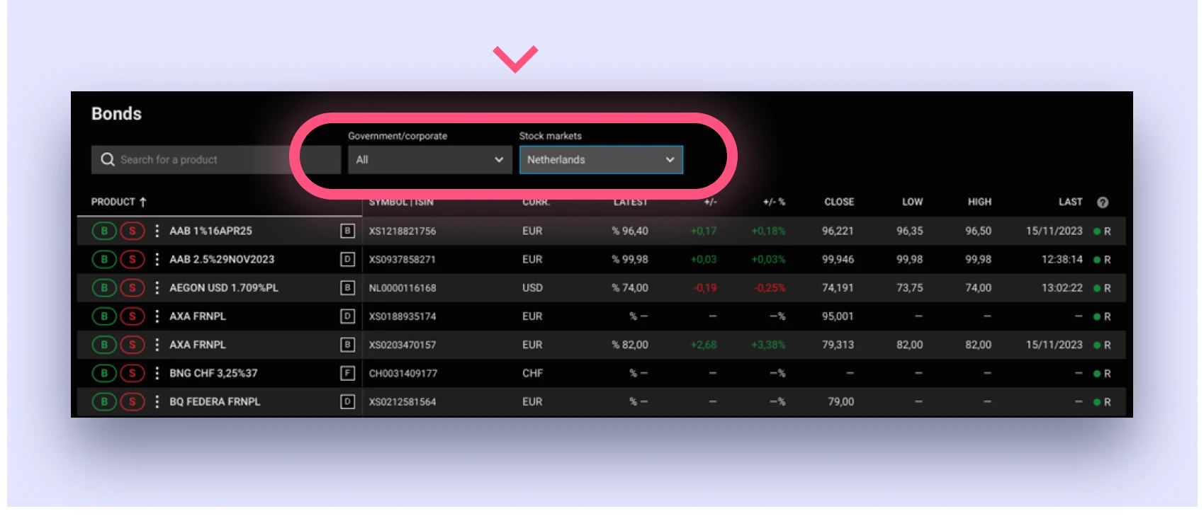 The current filters allow you to sort bonds by Government/Corporate type and by exchange.