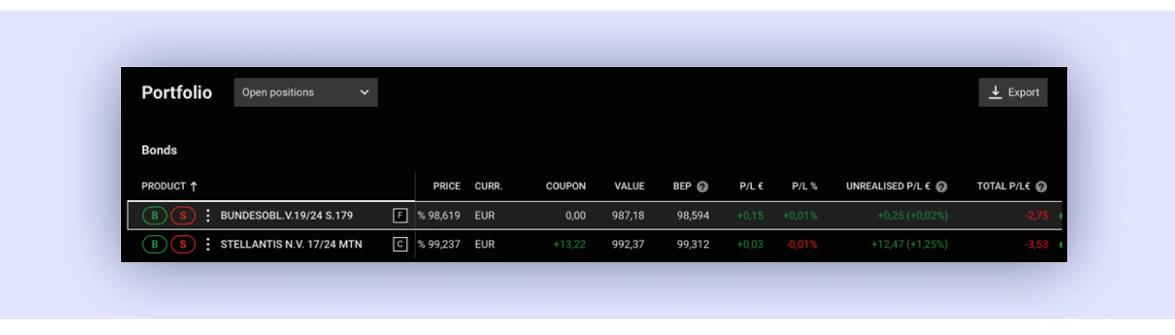 DeGiro provides basic analytics for your bond portfolio, including the calculation of total financial results.