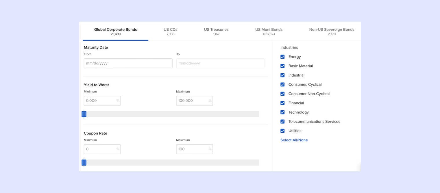 The Bond Scanner tool on IB, accessible here, is the exclusive feature for viewing the entire range of bonds available on the platform. It offers a variety of filters to help find bonds that meet specific criteria: