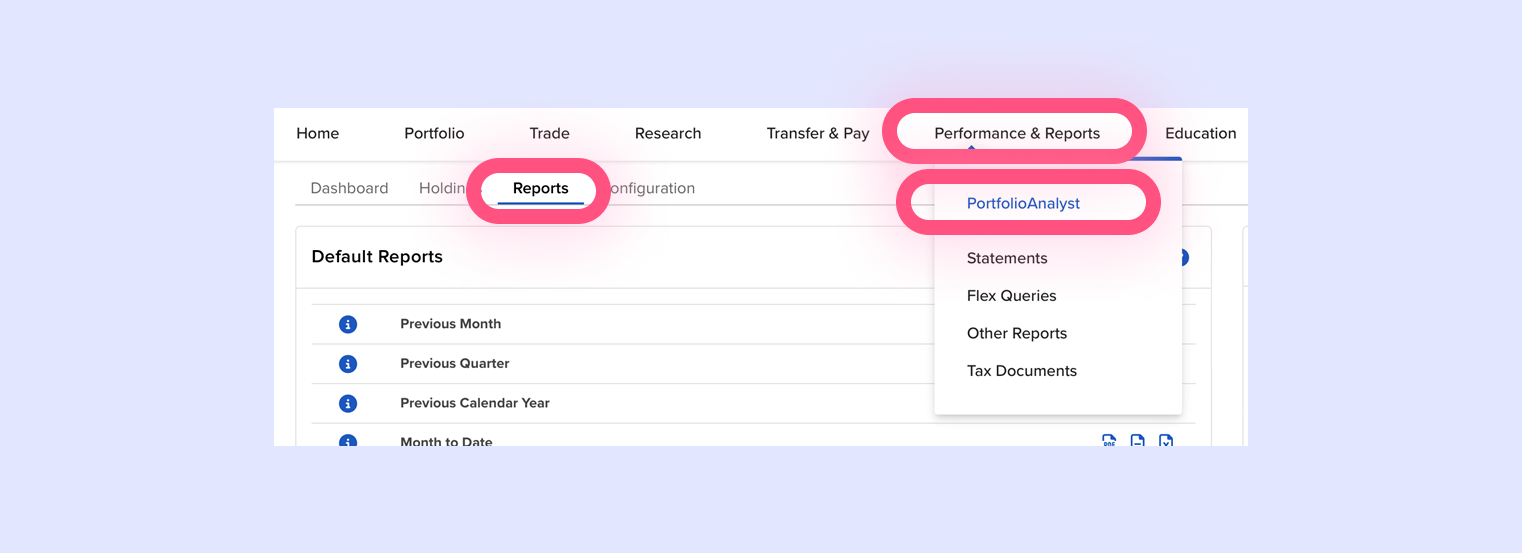 IB offers comprehensive portfolio analytics through its client portal. To access this, log into the Client portal and navigate to "Performance & Reports" – "PortfolioAnalyst" – "Reports."