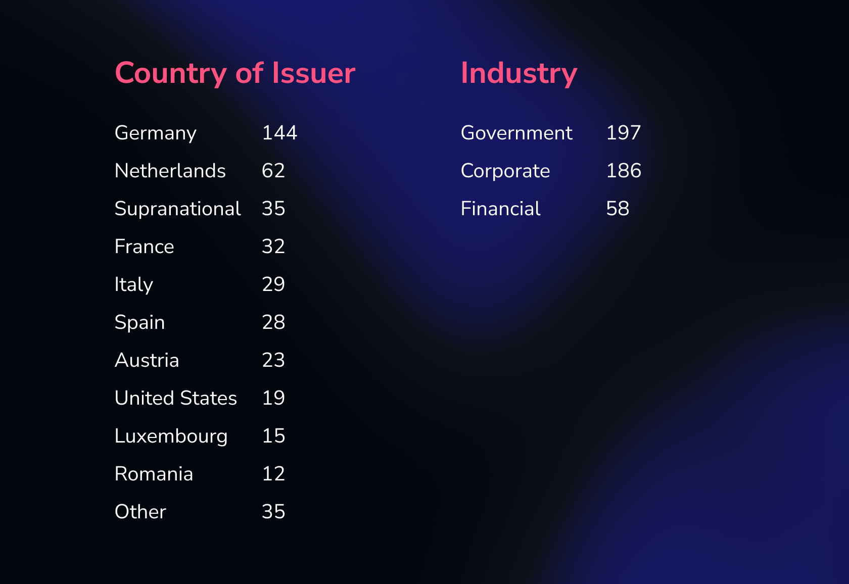 The platform provides filters for bond searches, including Tenor, Country of issuer, Industry, and Government/Corporate type.