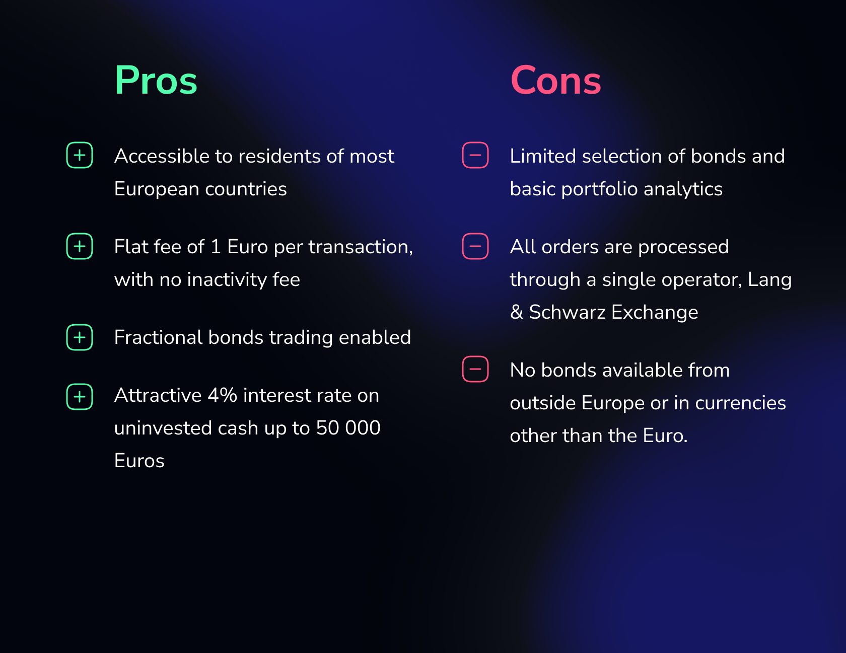 Trade Republic stands out as a remarkably cost-effective option for European individuals looking to invest in European bonds. Notably, it's the only European broker that offers the unique capability to trade fractional bonds, a feature they introduced as recently as September 2023. Additionally, Trade Republic provides access to trading stocks, ETFs, and offers ETF savings plans, fostering a culture of long-term and regular investment.