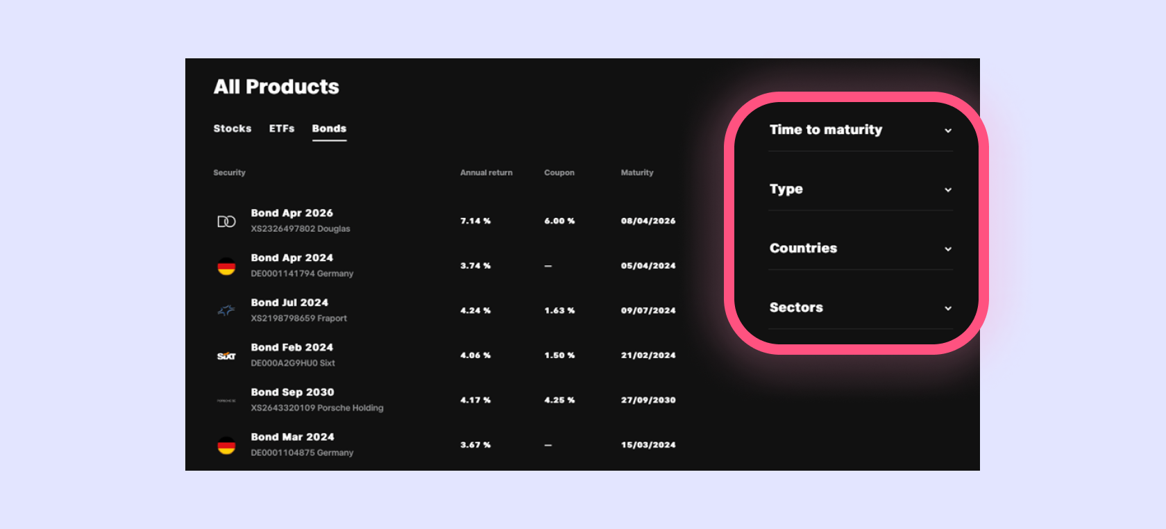 Interestingly, Lang & Schwarz Exchange lists a much larger number of bonds – over 3 000 – indicating that the range of bonds available on Trade Republic's platform has the potential to expand significantly in the future.