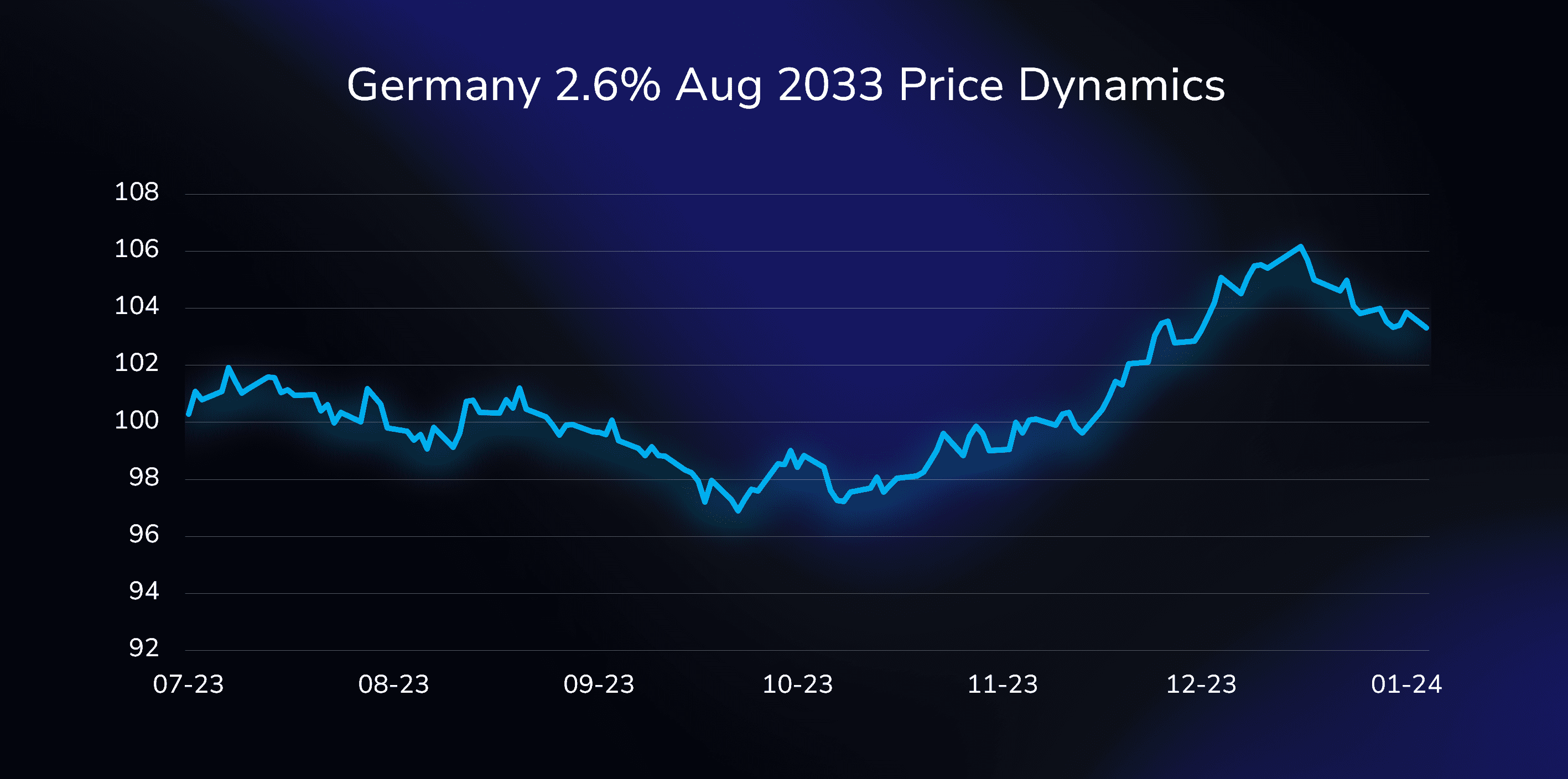 To illustrate, consider an investment in a 10-year German government bond (Bund) with a duration of 8.8 at the beginning of October 2023. This investment strategy would have yielded an impressive return of over 7% in euro terms in just three months.