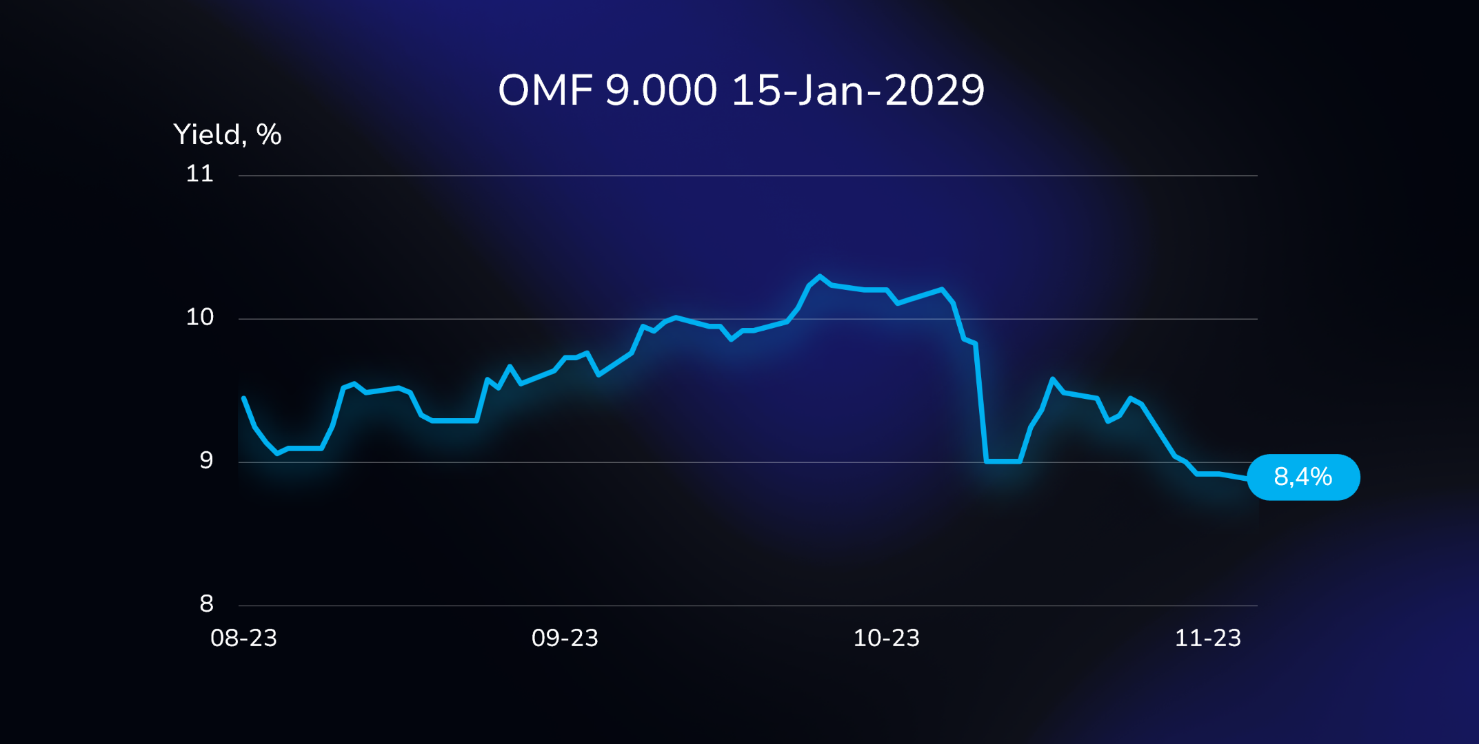 The bond market witnessed a substantial shift in the yield of OMF 9.000 15-JAN-2029 USD (US682695AA94), with a notable decrease of 53 basis points to 8.4% within a week.
