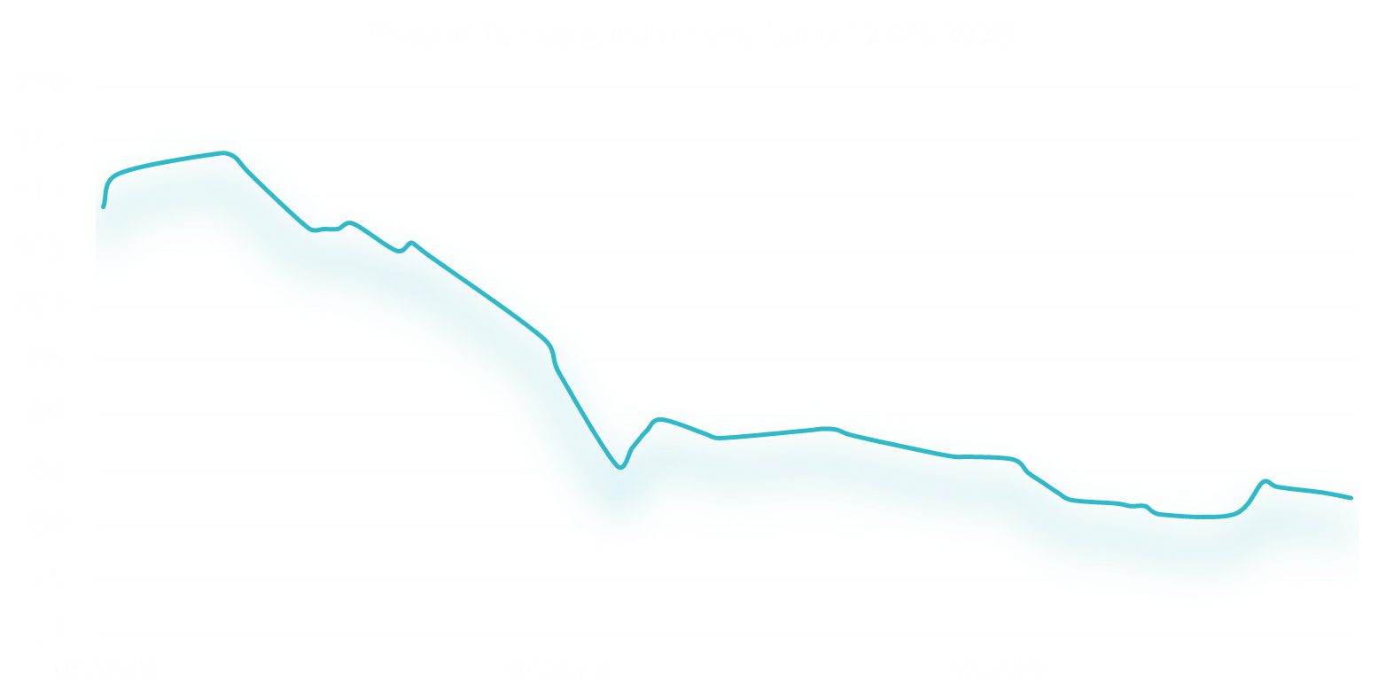 Between May 2023 and August 2023, the Turkish central bank raised its policy rate from 8.5% to 17.5%. As a consequence, the price of a 5-year government bond on the chart above plummeted by over 25%.
